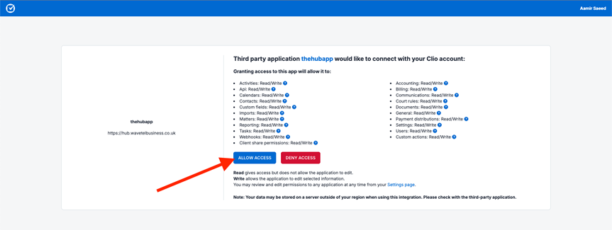 • It will open a CLIO Authentication page in your browser where you need to login your CLIO account and authorize the request to “TheHUB” app.